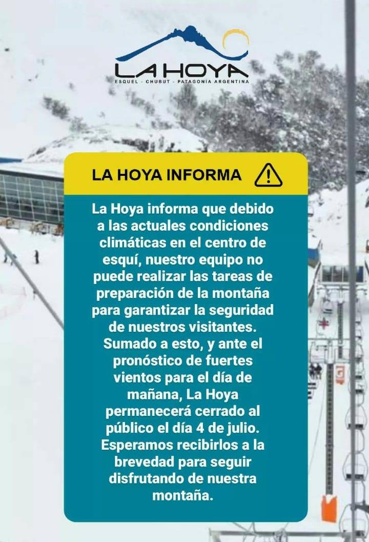 El Centro de Actividades de Montaña (CAM) La Hoya, informó a través de sus redes sociales que este lunes no se abrirán las puertas al público debido a las condiciones climáticas.