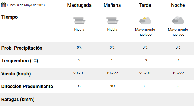 La jornada comienza con un cielo cubierto de niebla y una temperatura de 5°C. En horas de la tarde, se registrarán vientos de 23 y 31 kilómetros, mientras que a la noche estará mayormente nublado.