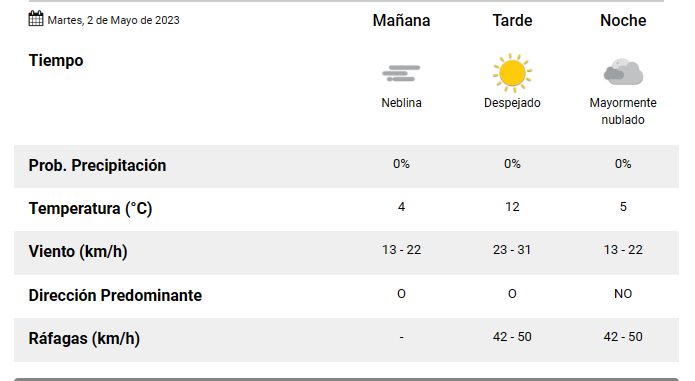 Según la información oficial que brinda la página del Servicio Meteorológico Nacional, este día martes en la ciudad de Esquel, tendremos una temperatura máxima de 12º C.
