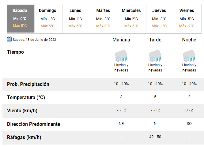 El pronóstico marca condiciones adversas, dado que está pronosticado lluvias y nevadas durante todo el el día.