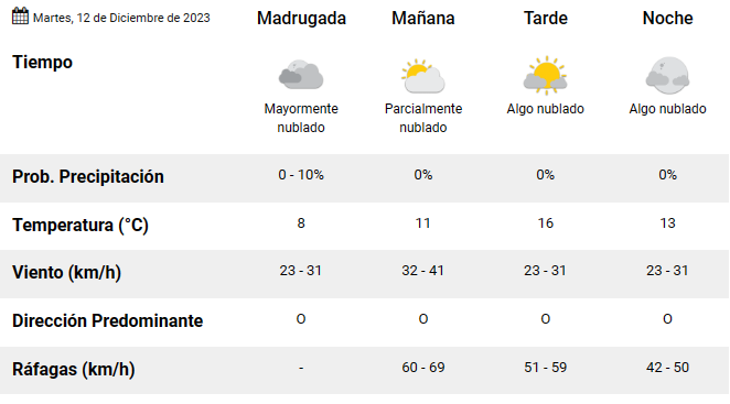 En las últimas horas del martes, la temperatura será de 13°C y se esperan vientos de 23y 31 kilómetros.