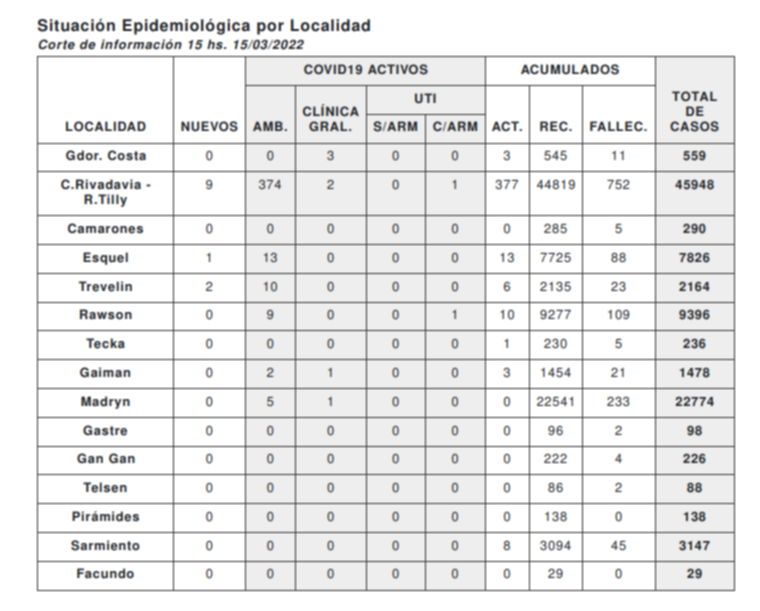 La cartera sanitaria además, informó que en las últimas horas no hubo decesos por COVID en Chubut.