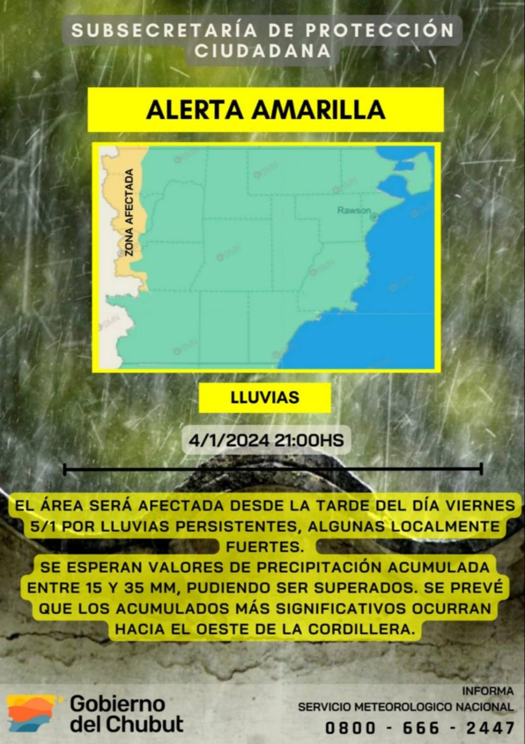 La información fue comunicada mediante la Subsecretaría de Protección Ciudadana de Chubut expresando que el área mencionada se verá afectada por lluvias persistentes, algunas localmente fuertes.