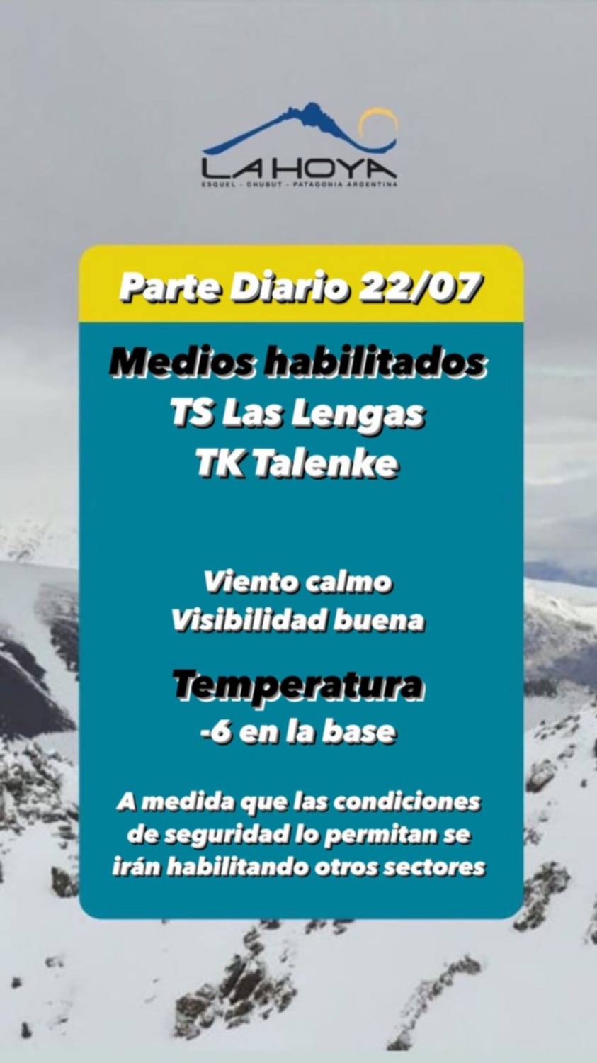 El primer parte diario indica que los medios TS Las Lengas y TK Talenke se encuentran habilitados. Asimismo se informó que a medida que lo permita el clima se irán habilitando nuevos sectores.