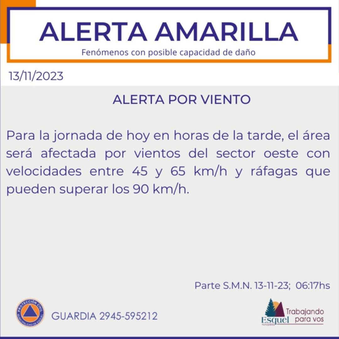 La Dirección de Protección Civil de la Municipalidad de Esquel anunció un alerta amarilla para el lunes 13 de noviembre en la ciudad, por fuertes vientos.
