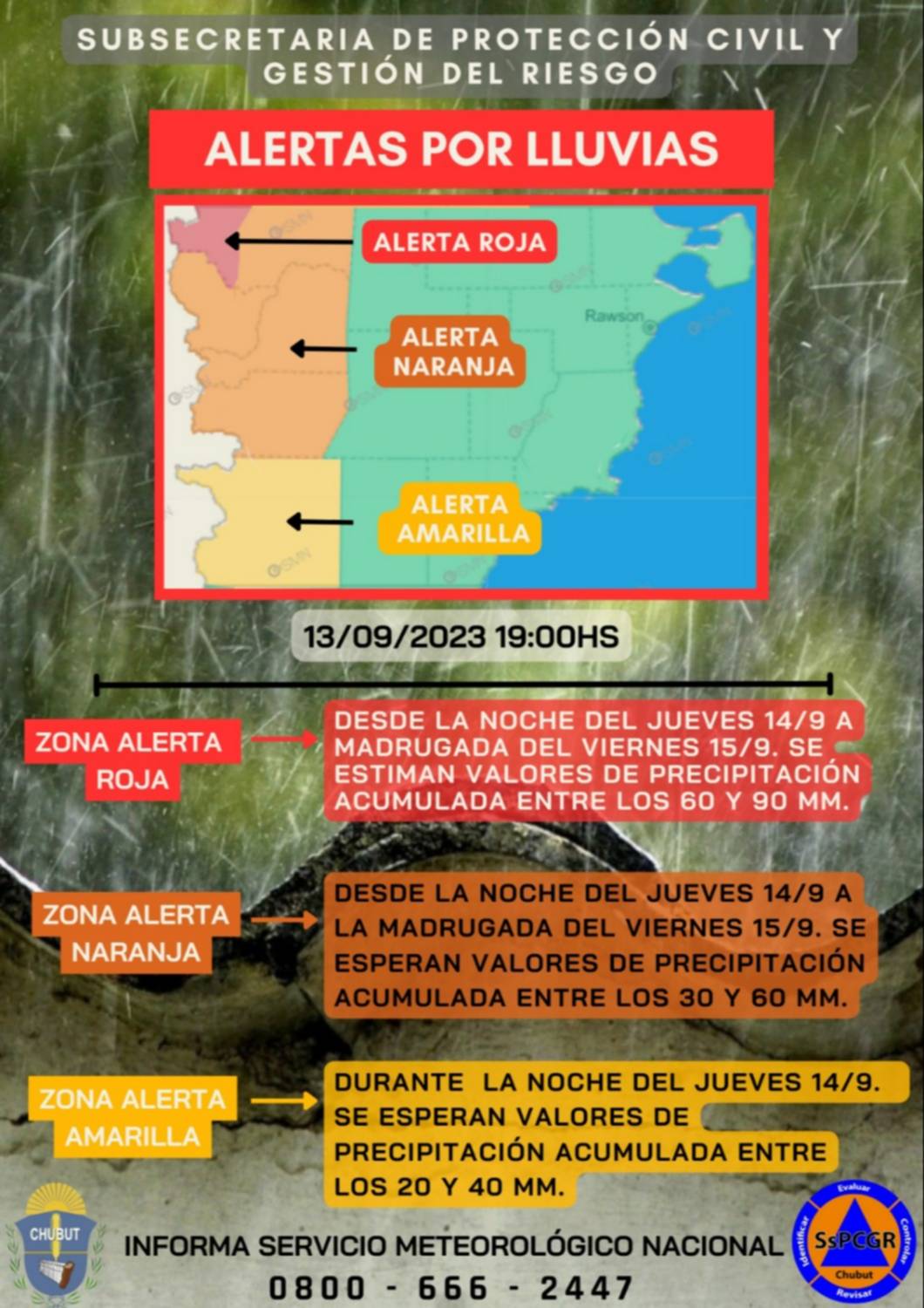 La Subsecretaría de Protección Civil de Chubut informó que rige un alerta roja por lluvias intensas en la cordillera, naranja en la zona oeste y amarilla en la zona sur de la provincia.