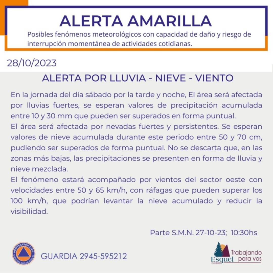 El Servicio Meteorológico Nacional anunció para este sábado 28 de octubre una alerta amarilla por fuertes lluvias en Esquel.