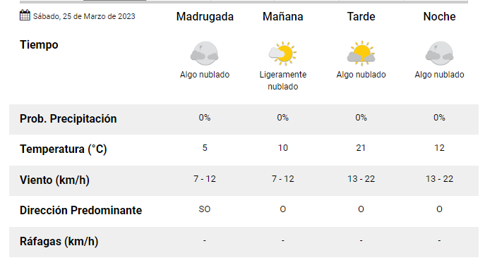 Según la información oficial que publica el sitio web del Servicio Meteorológico Nacional, este día sábado en la ciudad de Esquel, tendremos una temperatura máxima de 21°C.