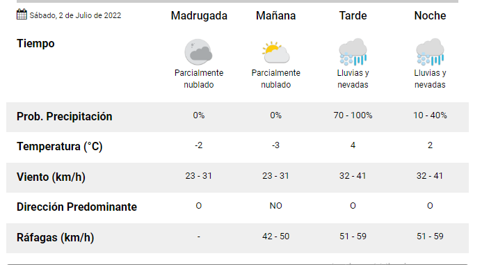 Según la información que brinda la página oficial del Servicio Meteorológico Nacional, este día sábado en la ciudad de Esquel, tendremos una temperatura máxima de 4°C.