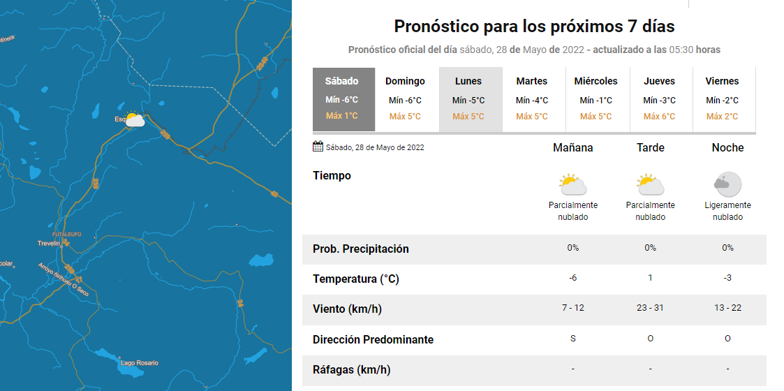 Cabe destacar que la Estación Meteorológica del SMN está en el Aeropuerto de Esquel, por lo que la temperatura podría llegar a unos grados más, pero igual será muy fría la jornada.