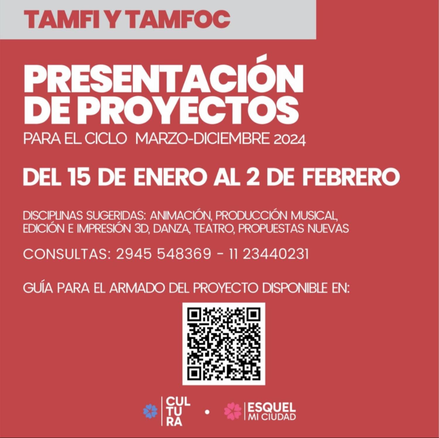 Los interesados pueden descargar la guía de armado de proyectos escaneando el código QR de la imagen o en el siguiente enlace: https://acortar.link/convocatoriatamfi2024
