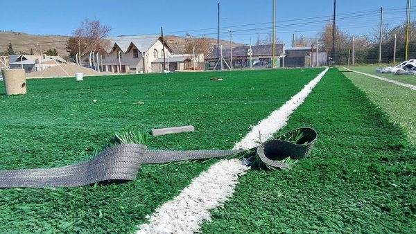 Los rollos de césped sintético estaban desde hace un tiempo al costado de la cancha de 5. Había que esperar el tiempo adecuado para el armado del mismo.