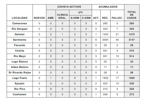 Sin fallecidos, Chubut sumó 11 nuevos casos de COVID