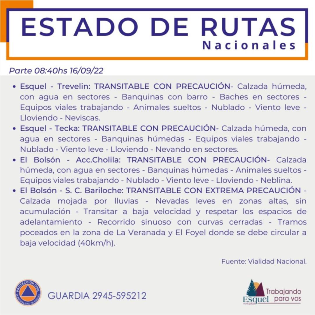 Vialidad Nacional dio a conocer este viernes 16 de septiembre un nuevo parte de rutas, anunciando que se encuentran transitables con precaución por presencia de agua y barro en la calzada.