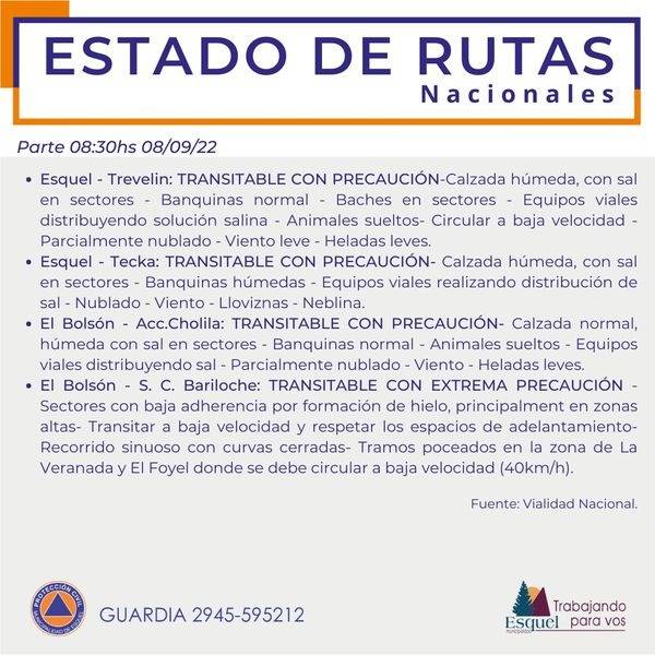 La Municipalidad de Esquel difundió el parte sobre el estado de las rutas nacionales y provinciales este jueves 8 de septiembre.