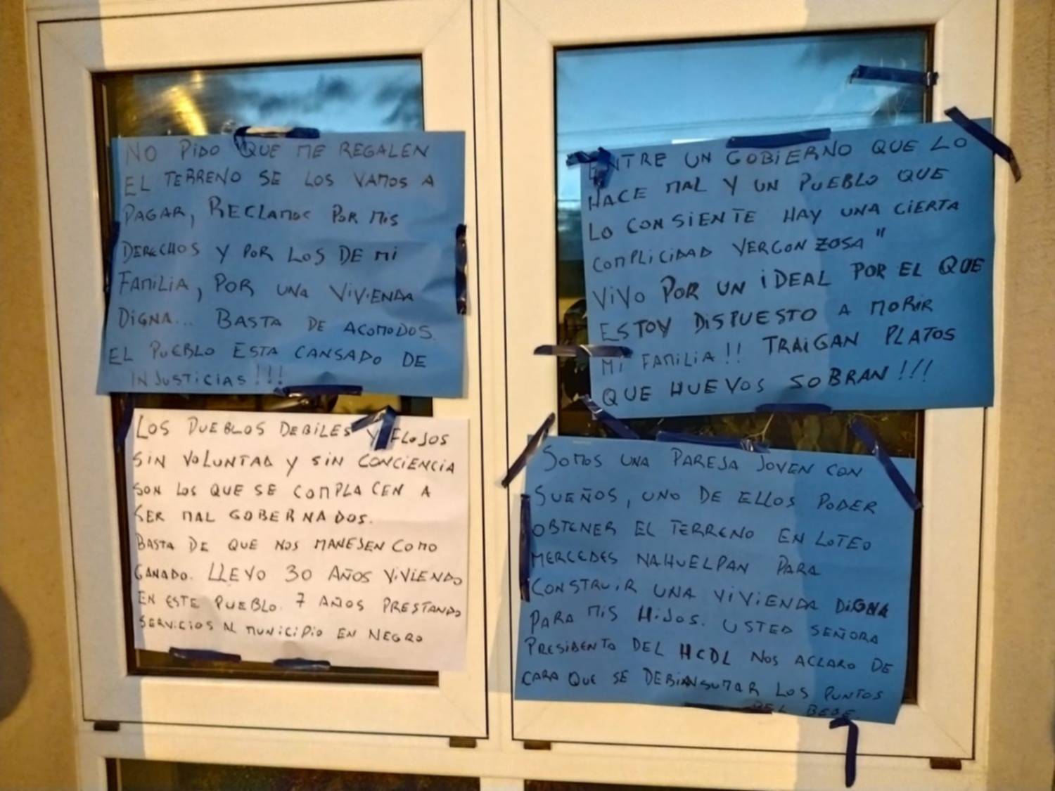 En tato, empapeló la puerta de acceso con afiches que explican el motivo del reclamo y sostiene que no pide que «le regalen nada, sino que lo quiere pagar». Además, destaca que solicita «una vivienda digna para su familia y que cesen los acomodos, porque el pueblo está cansado de la injusticia».