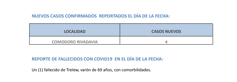 Además, informó el deceso de una persona de la ciudad de Trelew, de 69 años, con comorbilidades.