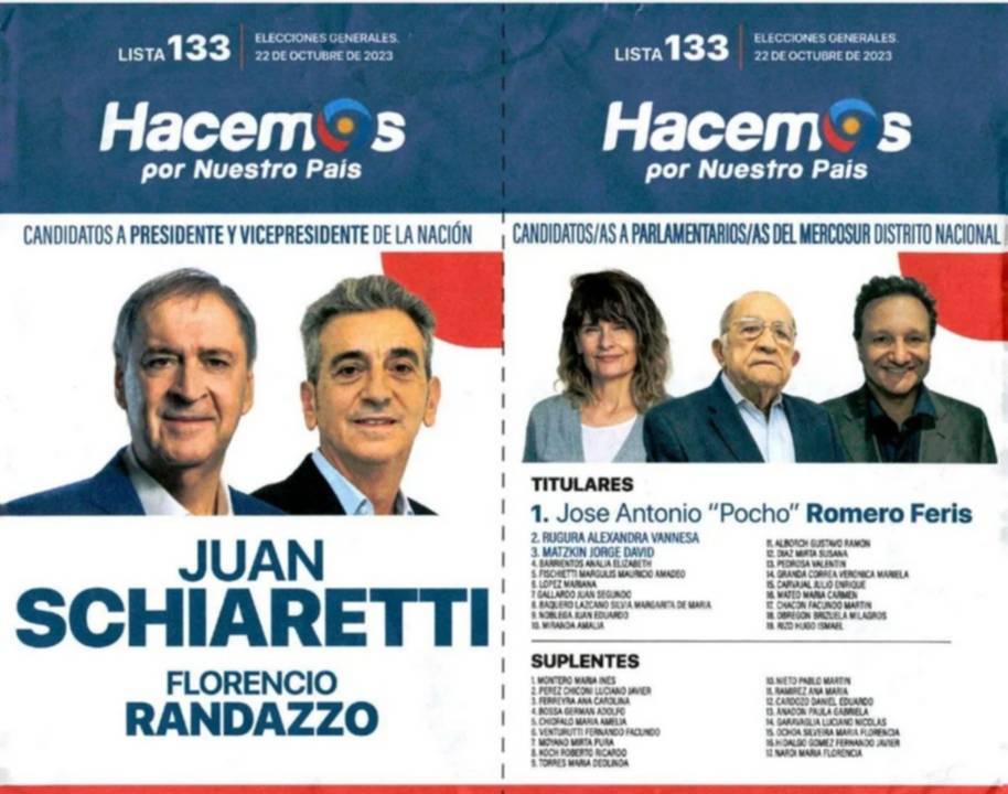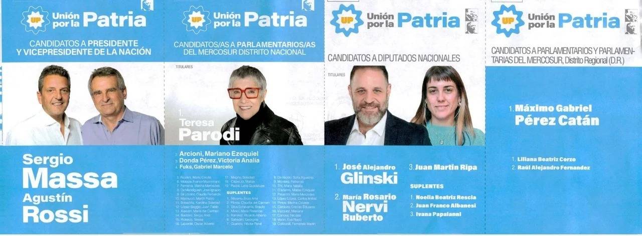 La lista 134 de Unión por la Patria, boleta encabezada por la fórmula presidencial Sergio Massa-Agustín Rossi, con la presencia de Mariano Arcioni en segundo lugar de la lista nacional del Parlasur, y con José Glinski en la lista de diputados y Máximo Pérez Catán en Parlasur distrito Regional.