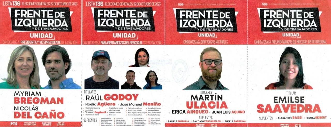 La lista 136, del Frente de Izquierda y de Trabajadores – Unidad, con la fórmula presidencial Myriam Bregman-Nicolás Del Caño. En la lista nacional del Parlasur lleva a dos chubutenses, como Agustín Gigli y Martín Sáez. En Diputados Nacionales, encabeza Martín Ulacia, y en distrito regional al Parlasur, Emilse Saavedra.