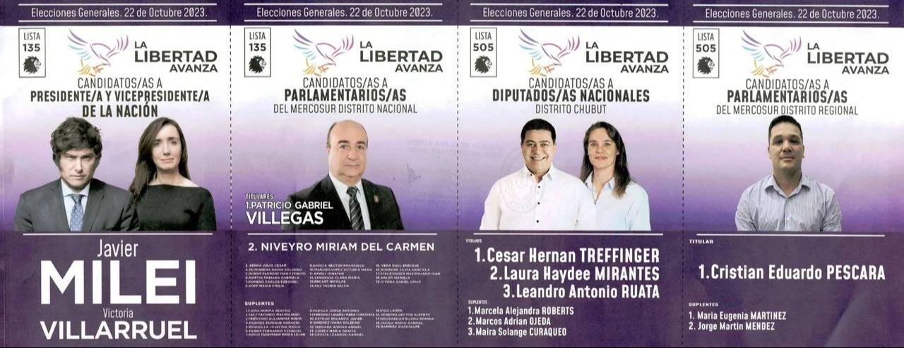 La lista 135 es de La Libertad Avanza, con la fórmula Javier Milei-Victoria Villarruel, que encabeza César Treffinger en Diputados Nacionales y lleva al dirigente de la UTA, Cristian Pescara, al Parlasur por el Distrito Regional.