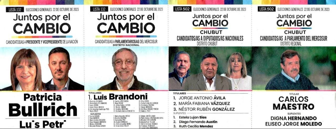 La lista 132, de Juntos por el Cambio, con la fórmula presidencial Patricia Bullrich-Luis Petri, que en Chubut lleva lista de diputados nacionales encabezada por Jorge Ávila y a representante al Parlasur distrito regional a Carlos Maestro.