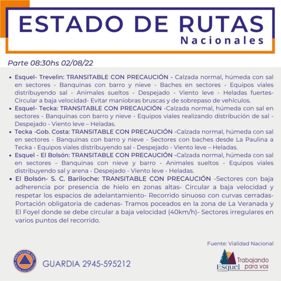 Asimismo, el tramo Esquel – Tecka se encuentra transitable con precaución. Mientras que en el camino Esquel- Bariloche por Ruta Nº 40 piden circular con precaución.