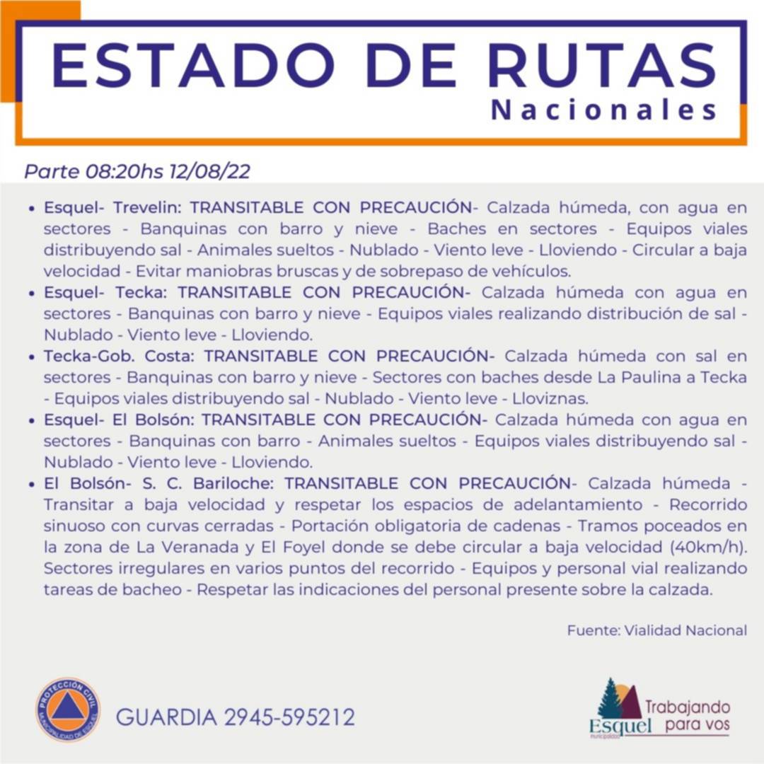 En este marco, informaron que la ruta Nº 259 hacia Trevelin se encuentra transitable con precaución. La calzada se encuentra normal y húmeda en determinados sectores.