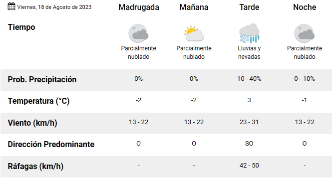 La jornada comienza con un cielo parcialmente nublado acompañado de una temperatura de -2°C. En horas de la tarde se esperan lluvias y nevadas con vientos de 23 y 31 kilómetros.