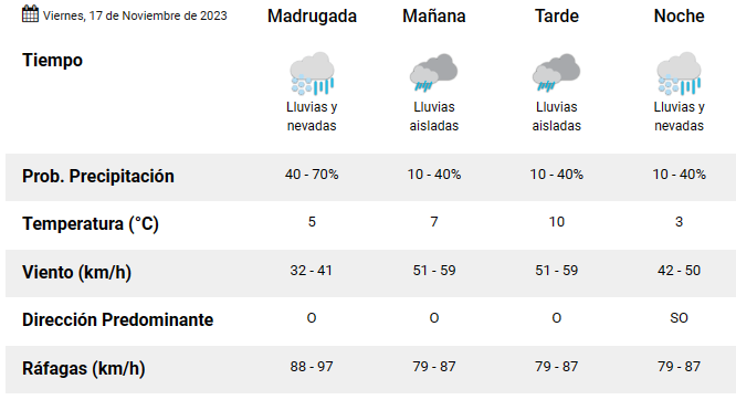 En las últimas horas del viernes, se esperan lluvias y nevadas con una temperatura de 3°C.