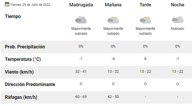 La jornada comienza con un cielo mayormente nublado y con una temperatura de -4°C. En horas de la tarde, habrán vientos de 13 y 22 kilómetros, mientras que a la noche la temperatura será de -1°C.