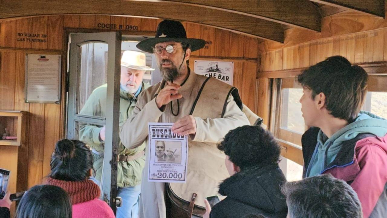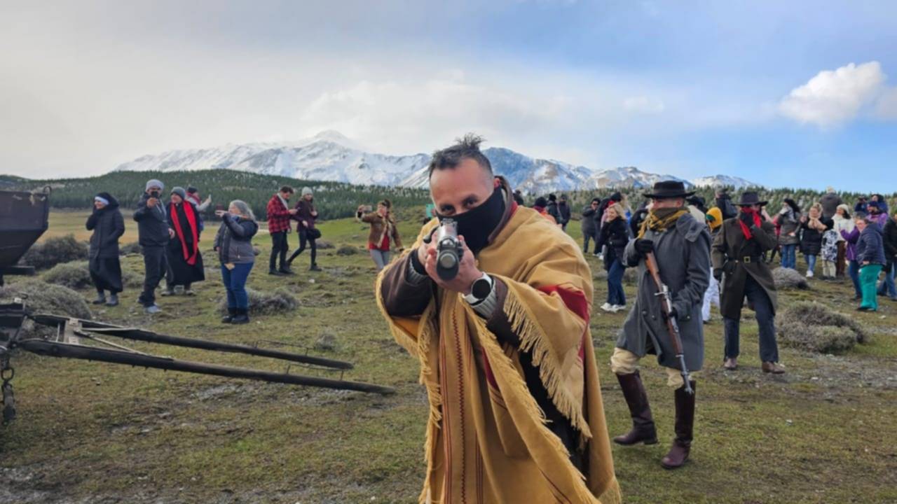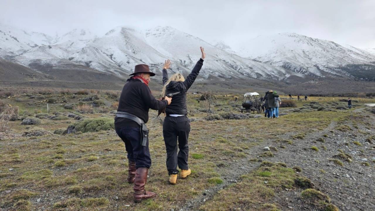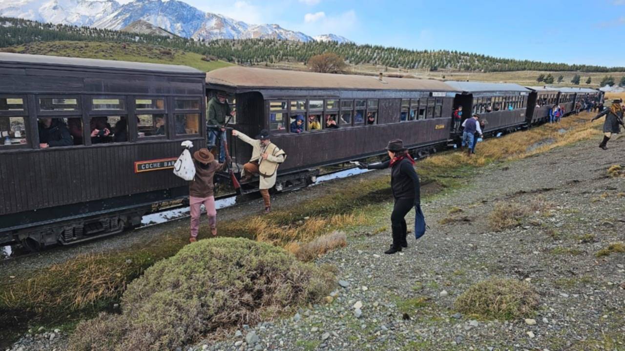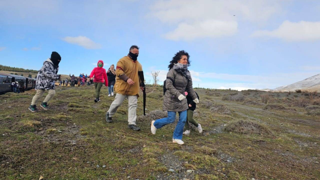 Los actores y los pasajeros vivieron un momento inolvidable en las cercanías de Esquel, cuando por sorpresa un grupo de «forajidos» armados detuvieron La Trochita.