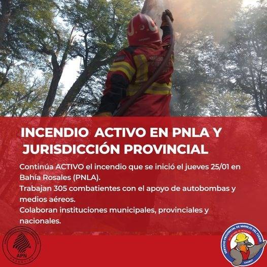 Continúa activo el incendio que se inició el día jueves 25/01, en la zona de Bahía Rosales (PN Los Alerces).